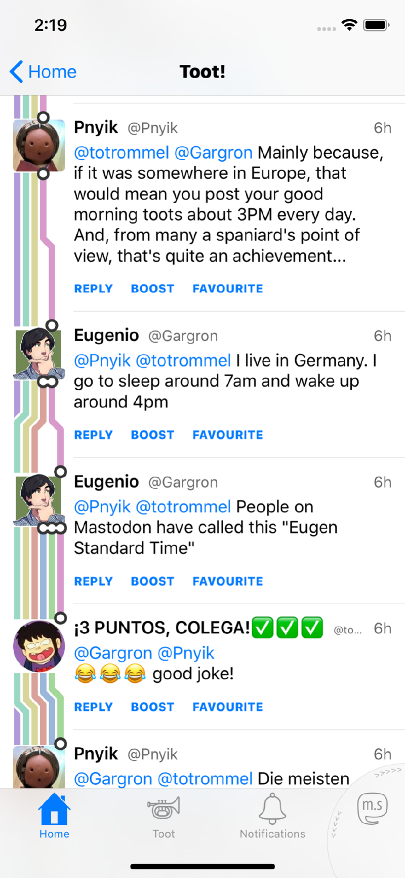 还有一个我比较喜欢的功能是在toot的回复中会使用不同颜色来显示不同的thread(这个中文怎么翻译),如下图(此处为Toot! for mastodon开发者账号发的图,不是我的):