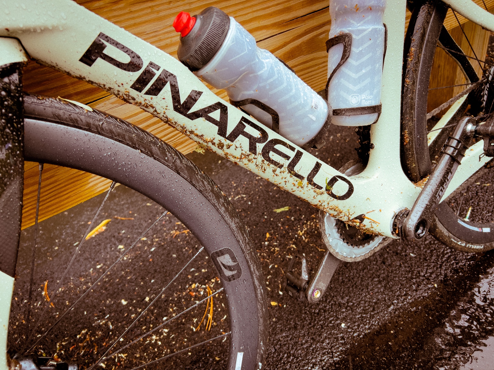 Mark tried to wipe water off his saddle and handlebar with paper towels, at the same time saying “I don’t know why I do this because it’ll get wet in 5 seconds”, which I totally agree. While he was wasting his energy doing that, I took pics of my filthy new bike.