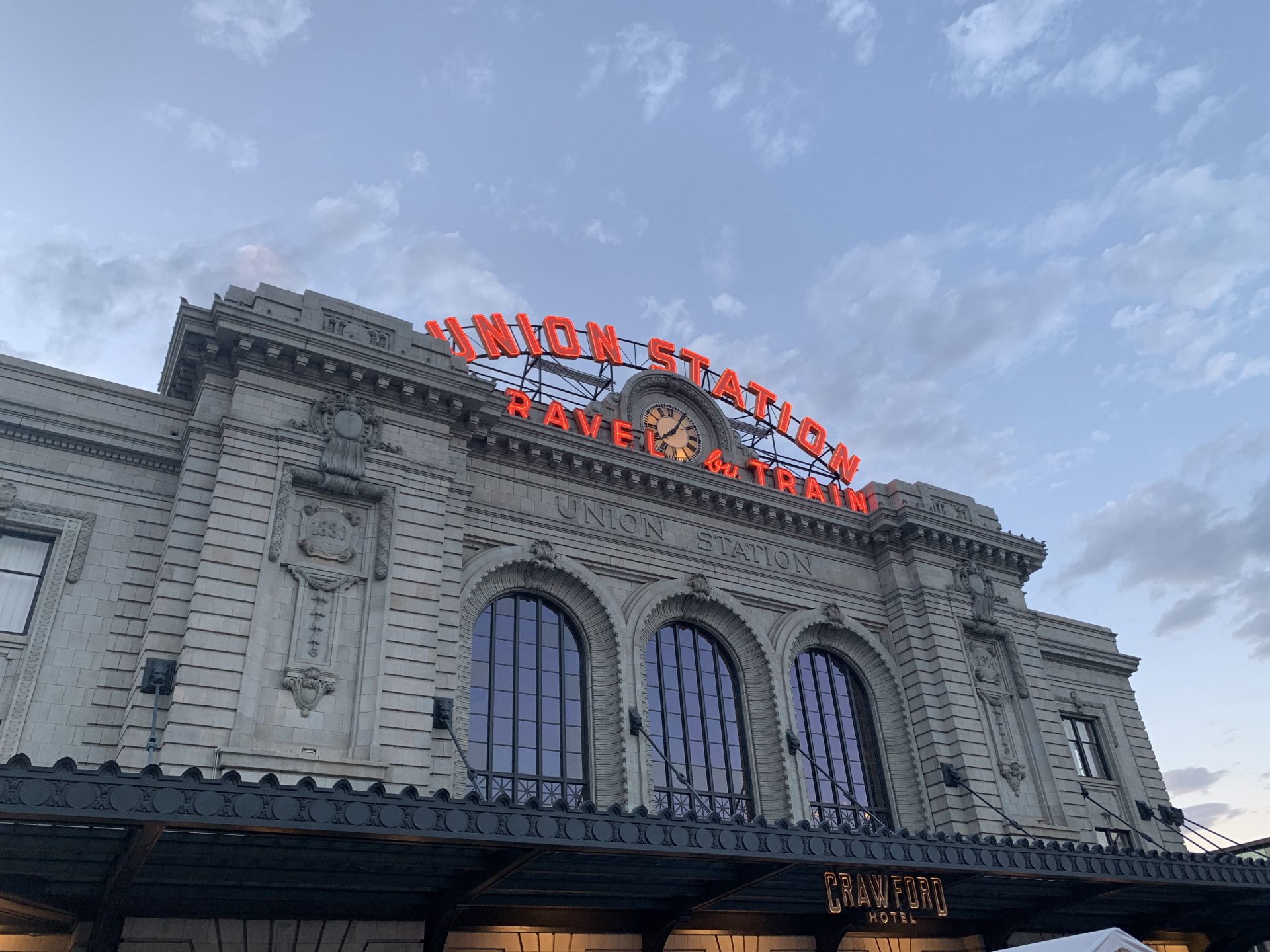 The train stopped at Denver Union Station and passengers are allowed to get off the train and walk around. It was about 15-20 mins break. We got off the train and walked around in the station. Most of the business were closed. But the train station itself was a beautiful architecture. The train was delayed about an hour before arriving into the Denver station. But I got a very nice shot of the train track in the evening.