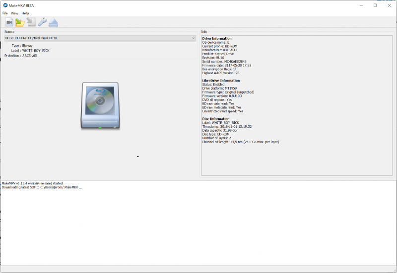After installation and inserting your disc into the optical drive, open MakeMKV. It’ll scan the disc automatically, looking for some basic info about that disc. After that it’ll settle down with the following window: