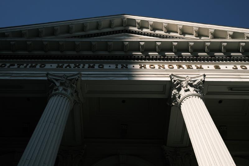 35mm full frame equivalent lens is very hard to cover the full picture of the building. However I caught the moment when the sun was shining on half of the building and there was a clear line between the shadow and the highlight. The symmetric composition is powerful to show the beauty of architecture.