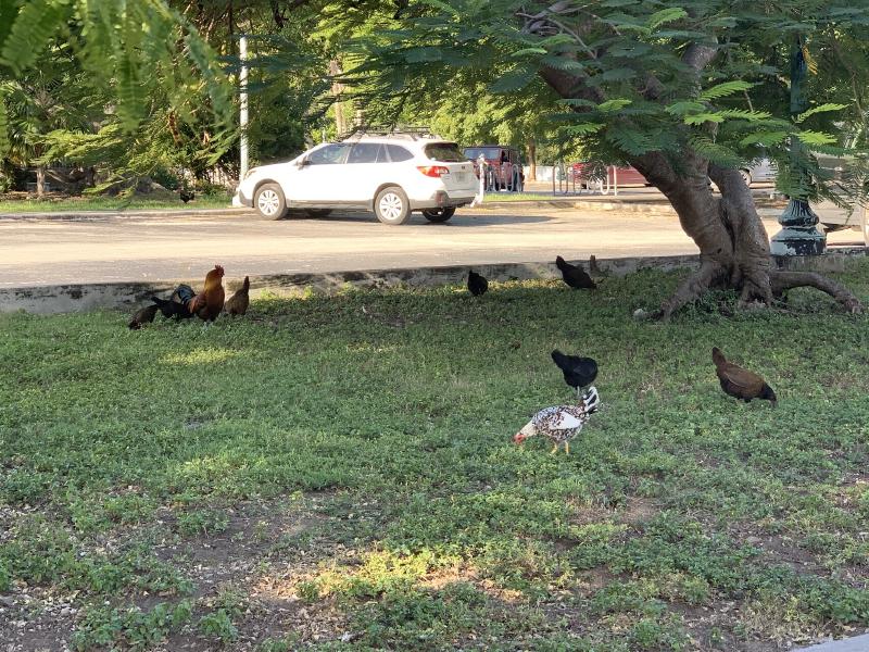 There were a group of chickens running around the streets, right in the city. They were eating something on the grass, just like no one was around. It’s very interesting to see chickens around. Not sure if they were wild or not.