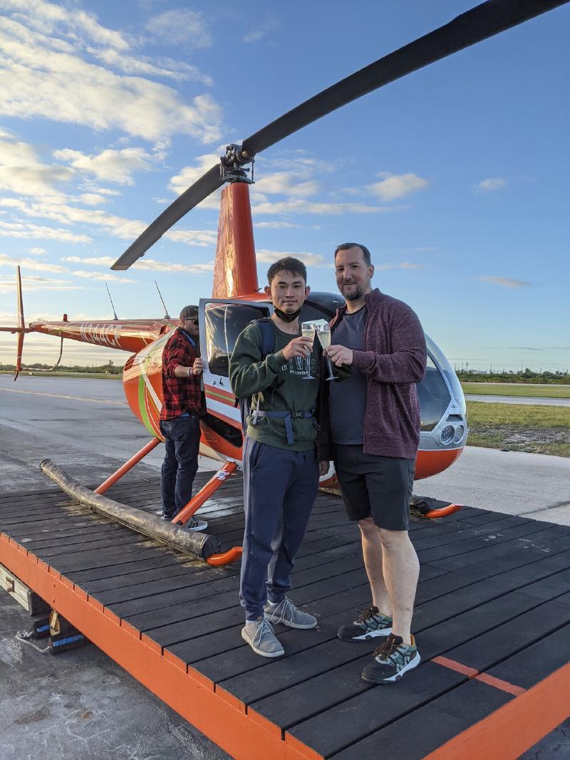 Helicopter Sunset tour was definitely the most exciting thing we did in Key West. It started from a side terminal in the airport. That side terminal seems like to be used for private jet pilots and other airport staff. We waited in the lobby and someone came and called my name. Then he drove us in a golf cart to the helicopter pad. We were greeted by the pilot Brian and two glasses of champagne.