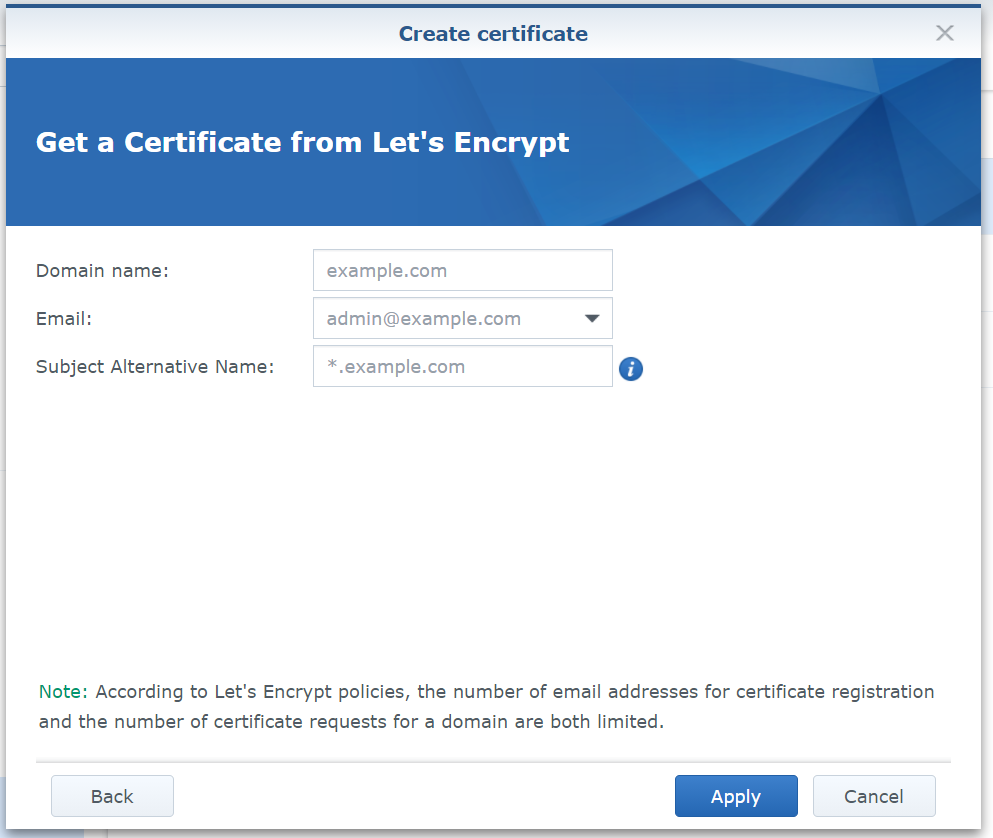Type in your domain name, email and alternatives. But wildcard is only supported for Synology DDNS :(