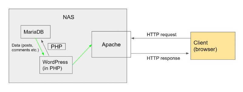 Apache is a very popular web server. When WordPress is being set up on NAS, we are essentially creating a web server, and that’s why Apache is needed by WordPress.