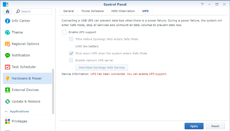 After connecting UPS to the NAS, some settings needs to be done in DSM. In Control Panel -> Hardware & Power -> UPS tab, DSM should already show you that it detected a UPS connected: